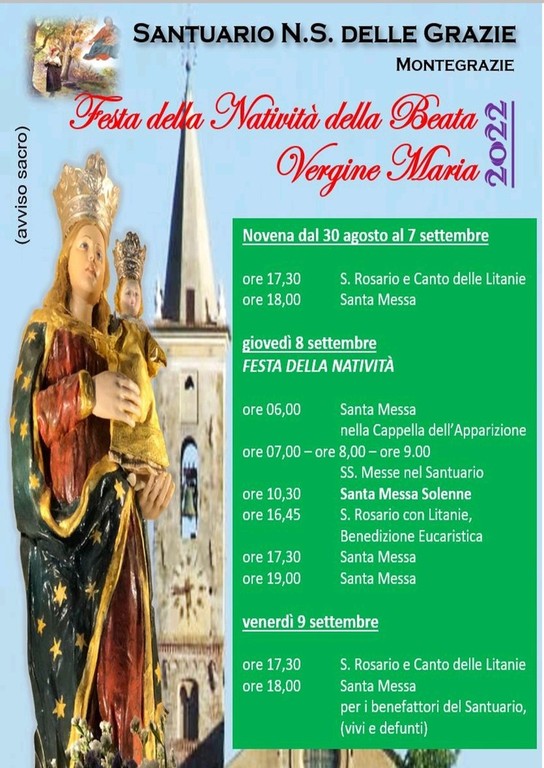 In occasione della Festa, giovedì, saranno celebrate sei sante Messe, la prima alle ore 6 del mattino nella cappella dell'apparizione. Seguiranno le S. Messe nel Santuario alle ore 7, 8, 9, alle 10 e 30 la S. Messa solenne, alle 16.45 S.Rosario e litanie, Benedizione Eucaristica, ore 17.30 S.Messa. L'ultima Messa nel pomeriggio sarà celebrata alle ore 19.