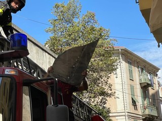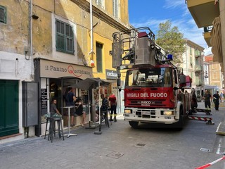 Sanremo: crollano pezzi di cornicione in via Palazzo, intervento dei Vigili del Fuoco che chiudono la strada (Foto)