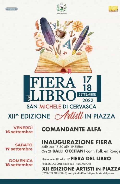 Domenica, dalle 10 del mattino circa, 40 artisti del territorio presenteranno le loro opere nella piazza della frazione. A fare da introduzione alla Fiera del Libro, alle 20:45 di venerdì 16 settembre nel salone polivalente del capoluogo, la serata dedicata alla figura del Comandante Alfa, il carabiniere più decorato d'Italia, e la presentazione del suo ultimo libro: Parola d'ordine: proteggere – La mia vita in difesa degli altri. A moderare la serata, la giornalista Ada Origlia.