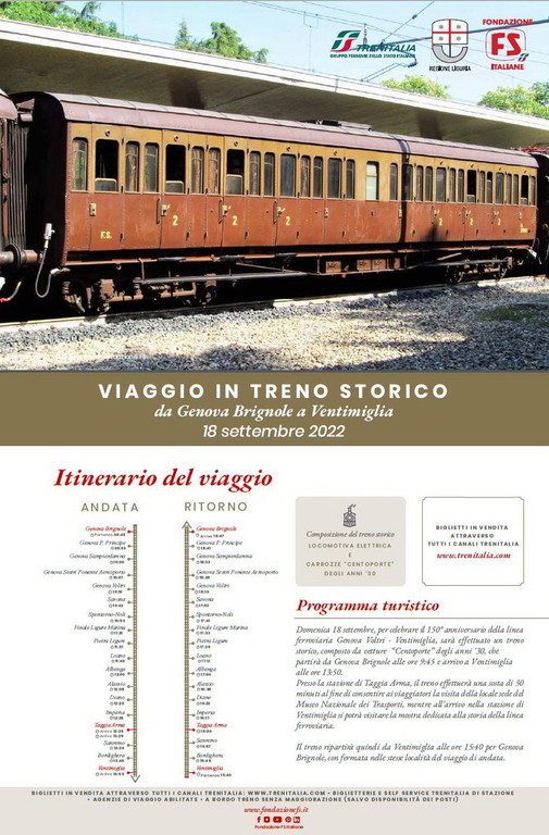 Il treno effettuerà una sosta di 50 minuti alla stazione di Taggia Arma per consentire ai viaggiatori la visita al Museo Nazionale dei Trasporti, mentre all’arrivo nella stazione di Ventimiglia, ore 13.50, si potrà visitare la mostra dedicata alla storia della linea ferroviaria, una linea costiera di enorme fascino che ha contribuito in maniera fondamentale allo sviluppo turistico ed economico della Liguria di Ponente.