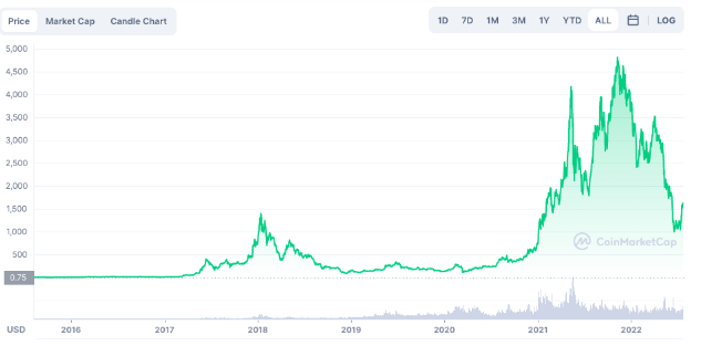 Ethereum è l’altcoin a maggiore capitalizzazione di mercato e la seconda più importante sul mercato crypto. La capitalizzazione di mercato supera i 200 miliardi di dollari. Nel 2021 Ethereum ha raggiunto la maggiore quotazione di sempre con un ATH di 4.900$ a novembre, prima di subire poi la correzione che ha caratterizzato il 2022.