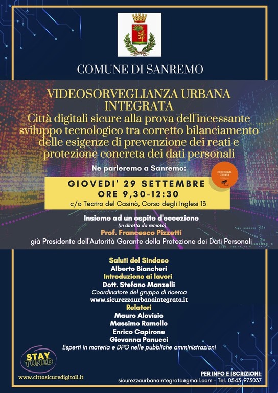 Sanremo è città videoprotetta e diventa quindi sede ideale per confrontarsi sulla delicata prova dello sviluppo digitale tra corretto bilanciamento delle esigenze di prevenzione dei reati e protezione concreta dei dati personali. Il dualismo tra sicurezza e privacy che spesso divide cittadini e amministratori.