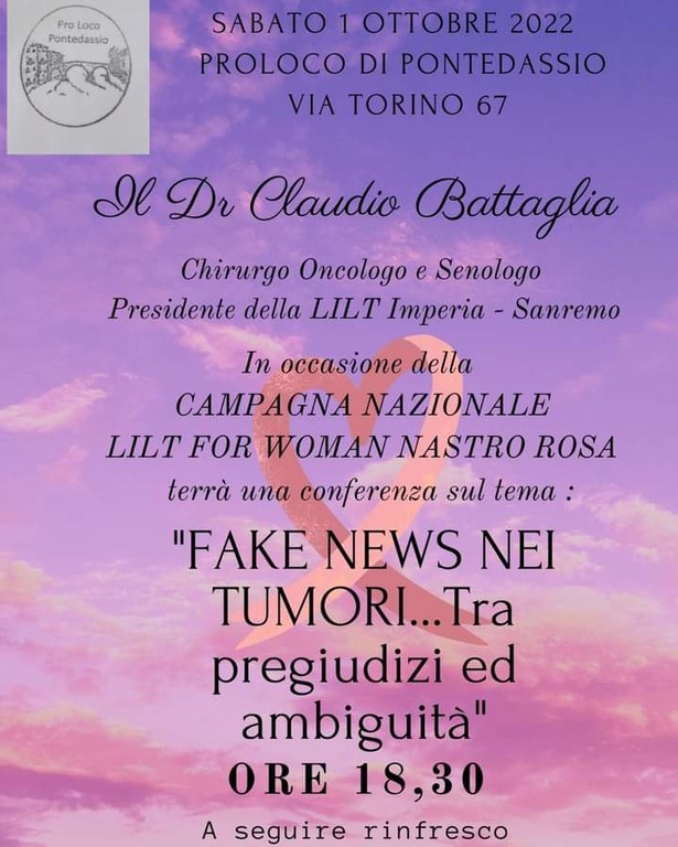 Si è rinnovata anche quest’anno la salda e proficua collaborazione tra la Proloco di Pontedassio e la Lega Italiana Lotta Tumori di Imperia-Sanremo, con la celebrazione dei 100 anni di attività della Lilt in concomitanza con il Mese Rosa dedicato all'informazione sull'importanza della Prevenzione.