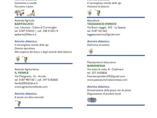 Sono 36 in tutto, da Ponente a Levante, le fattorie didattiche coinvolte nella manifestazione Fattorie Aperte, che svolgono attività formative e divulgative per le scuole nel campo dell'educazione alimentare, dell'agricoltura e dell'ambiente, tramite percorsi didattici gratuiti per scoprire i segreti dell'orto, del bosco, degli oliveti, dei vigneti e degli animali.