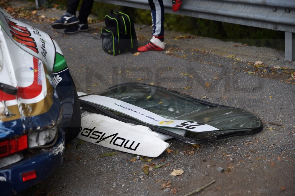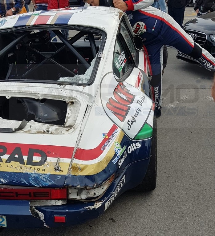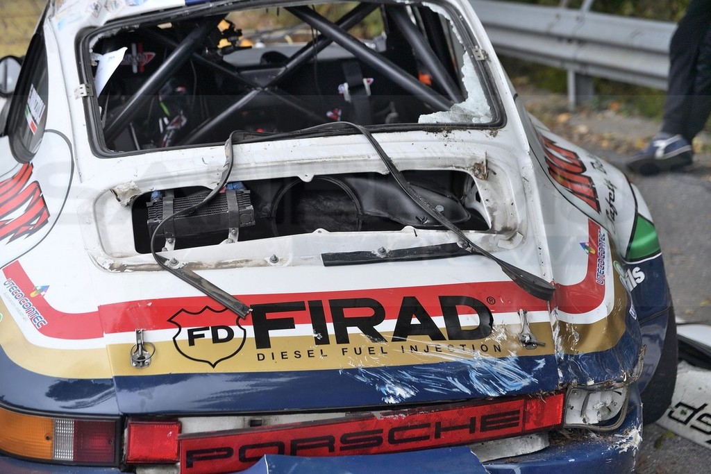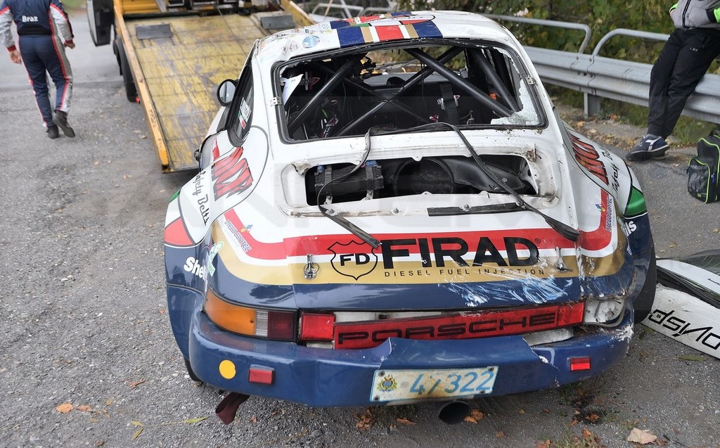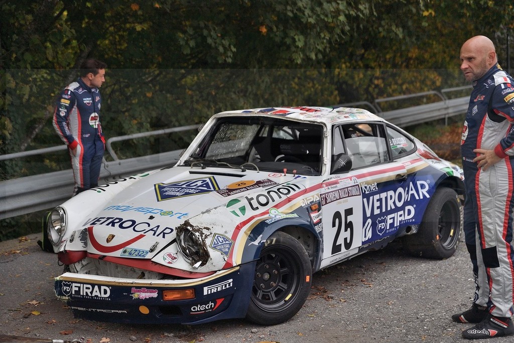 Sembra che la vettura abbia avuto un problema e, come si vede nelle immagini, all’uscita di un tornante, è uscita fuoristrada. Intanto al primo posto della garà c'è l'equipaggio formato da Lucio da Zanche e Daniele De Luis, su Porsche Carrera Rs