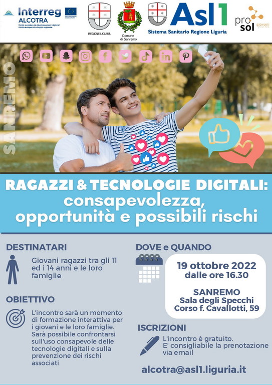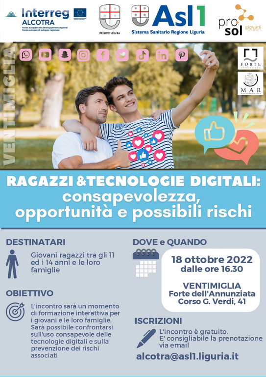 Martedì 18 ottobre 2022, alle 16.30 presso il Forte dell'Annunziata di Ventimiglia e mercoledì 19 ottobre 2022 presso la Sala degli Specchi di Palazzo Bellevue a Sanremo sempre alle 16.30, Asl1 nell'ambito dei progetti di Regione Liguria targati Interreg Alcotra e ProSol Giovani, ha organizzato il convegno dal titolo 'Ragazzi & tecnologie digitali: consapevolezza, opportunità e possibili rischi', i cui destinatari sono i ragazzi e le ragazze tra gli 11 ed i 14 anni e le loro famiglie. L'incontro sarà un momento di formazione interattiva per i giovani e le loro famiglie, nel quale sarà possibile confrontarsi sull'uso consapevole delle tecnologie digitali e sulla prevenzione dei rischi associati. La conferenza è gratuita, è consigliabile però la prenotazione via posta elettronica all'indirizzo alcotra@asl1.liguria.it.