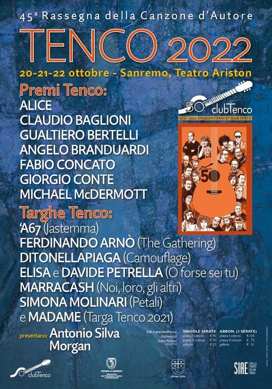 Il Club Tenco spegne 50 candeline e regala alla città un’edizione della rassegna che abbraccia la storia della musica e si affaccia su un ampio spaccato di contemporaneità. La 45ª edizione del Premio Tenco andrà in scena dal 20 al 22 ottobre con tre serate al teatro Ariston che racconteranno la scena musicale nel suo complesso.