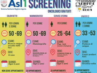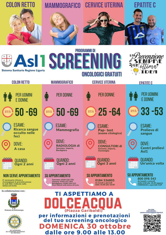 Il personale di Asl1, assieme ai volontari dei club service del Rotary Sanremo, Sanremo Hanbury e Imperia, saranno a disposizione della cittadinanza per dare informazioni e prenotare gli screening oncologici.