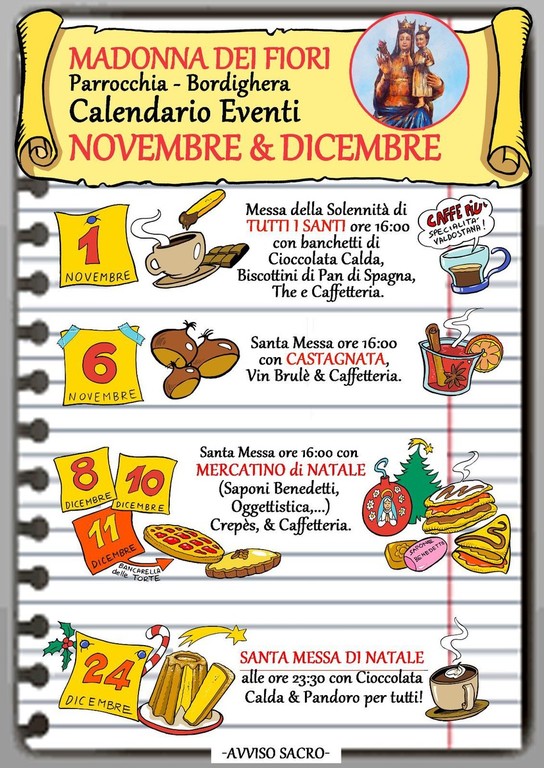 “Vi aspettiamo numerosi agli eventi di novembre e dicembre della parrocchia di Madonna dei Fiori a Bordighera" - dice Mara Bongianni, collaboratrice e curatrice della pagina Facebook della parrocchia Madonna dei Fiori.
