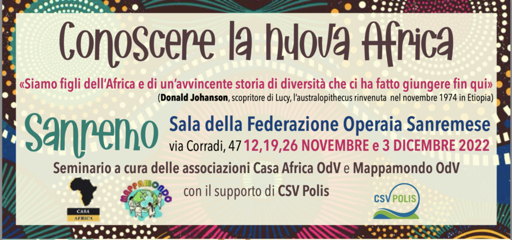 Sabato 12 novembre a partire dalle ore 16 nella sala della Federazione Operaia Sanremese si terrà il primo incontro del seminario 'Conoscere la nuova Africa' organizzato dalle associazioni Casa Africa e Mappamondo con il supporto del CSVPolis Imperia-Savona.