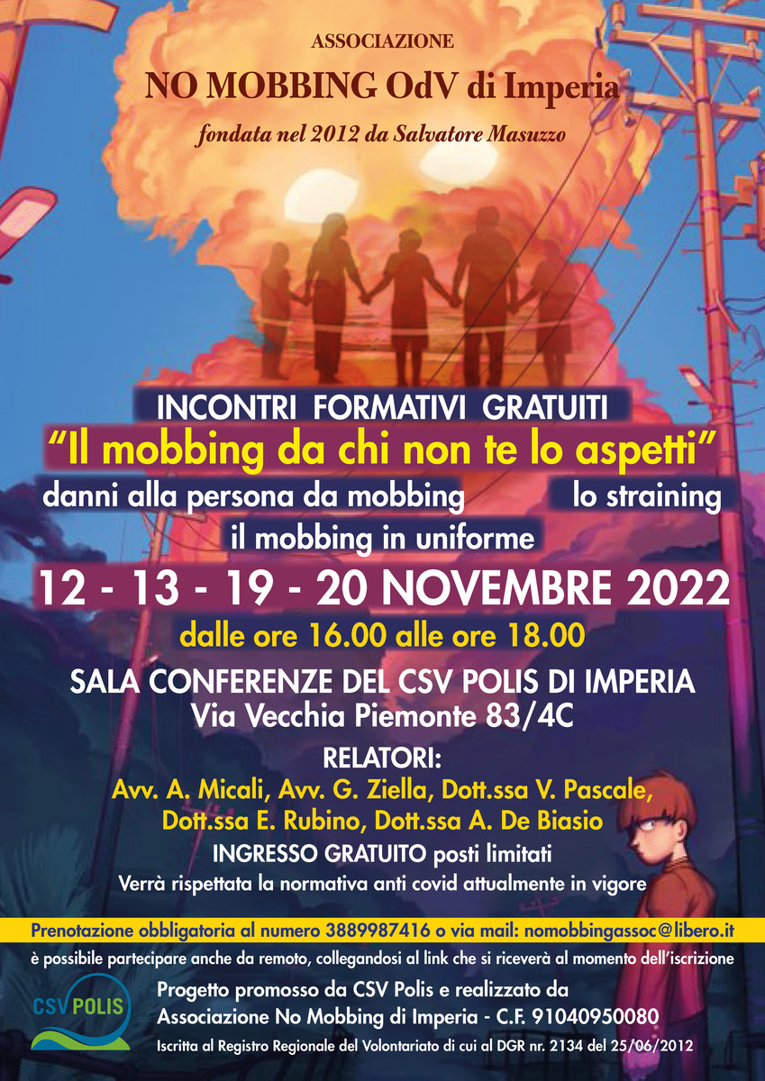 16.00. Seminario ‘Il mobbing da chi non te lo aspetti’ a cura dell’associazione ‘No Mobbing’ con relatori gli Avv. A.Micali – G. Ziella. Sala Conferenze Csv in via Vecchia Piemonte 83, anche domani, partecipazione gratuita, prenotazione al 388 9987416 (locandina)