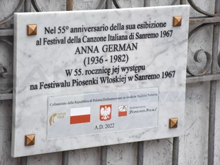 Anna German, unica cantante polacca ad essersi esibita finora alla kermesse canora sanremese, presentò sul palco del Casinò di Sanremo il brano “Gi” insieme a Fred Bongusto. La commemorazione è stata ideata dall’associazione italo-polacca Totus Tuus, in collaborazione con l’associazione italiana Ifimedia, e finanziata dal governo della Repubblica di Polonia con il patrocinio dell’Ambasciata di Polonia in Italia. La targa, realizzata dalla ditta Giuliano Marmi di Sanremo, sarà affissa nel cortile della chiesa della Madonna Nera di Czestochowa (corso Matuzia 3, Sanremo).