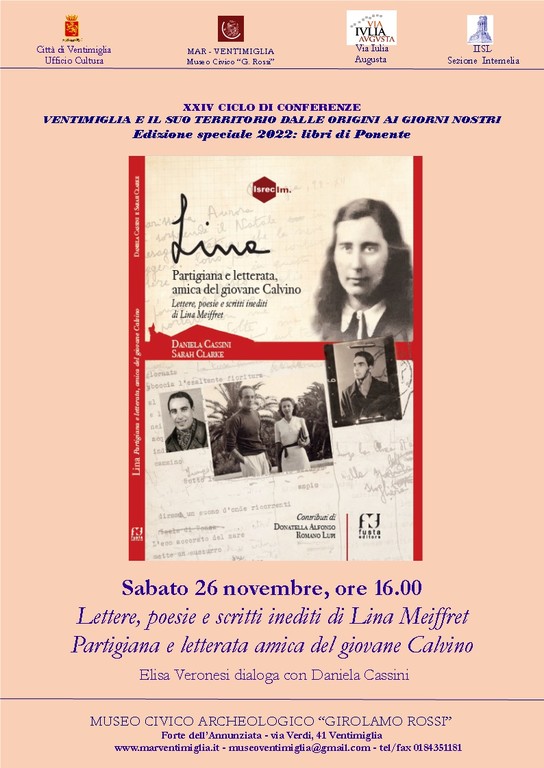 Tema di quest'anno i “Libri di Ponente” con la presentazione di alcune recenti edizioni che hanno come sfondo privilegiato l'estremo ponente di Liguria e Ventimiglia in particolare. Nell'incontro in programma sabato alle ore 16 dedicato alla presentazione del volume "Lettere, poesie e scritti inediti di Lina Meiffret. Partigiana e letterata amica del giovane Calvino", la critica letteraria Elisa Veronesi dialoga con Daniela Cassini, coautrice del volume con Sarah Clarke.