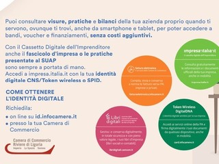 Servizio Cassetto digitale dell’imprenditore: attivato ad oggi da 13.259 imprese iscritte alla Camera di Commercio Riviere di Liguria (5197 a Savona, 3179 ad Imperia e 4883 alla Spezia), consente all’imprenditore di accedere a tutti i documenti ufficiali della propria azienda depositati al Registro imprese. Può scaricarli gratuitamente da pc, smartphone o tablet e condividerli in modo facile, sicuro e veloce. Sempre disponibili sono quindi: visure (anche in inglese), atti, bilanci, pratiche presentate agli Sportelli unici delle attività produttive (Suap), fascicolo elettronico, pagamenti del diritto annuale, dichiarazioni sostitutive. Dunque un supporto concreto a costo zero per la gestione degli adempimenti burocratici. Per accedere al Cassetto collegarsi al sito impresa.italia.it entrando con gli strumenti di identità digitale che identificano il cittadino-imprenditore: Spid (Sistema pubblico di identità digitale) o Cns (Carta nazionale dei servizi).