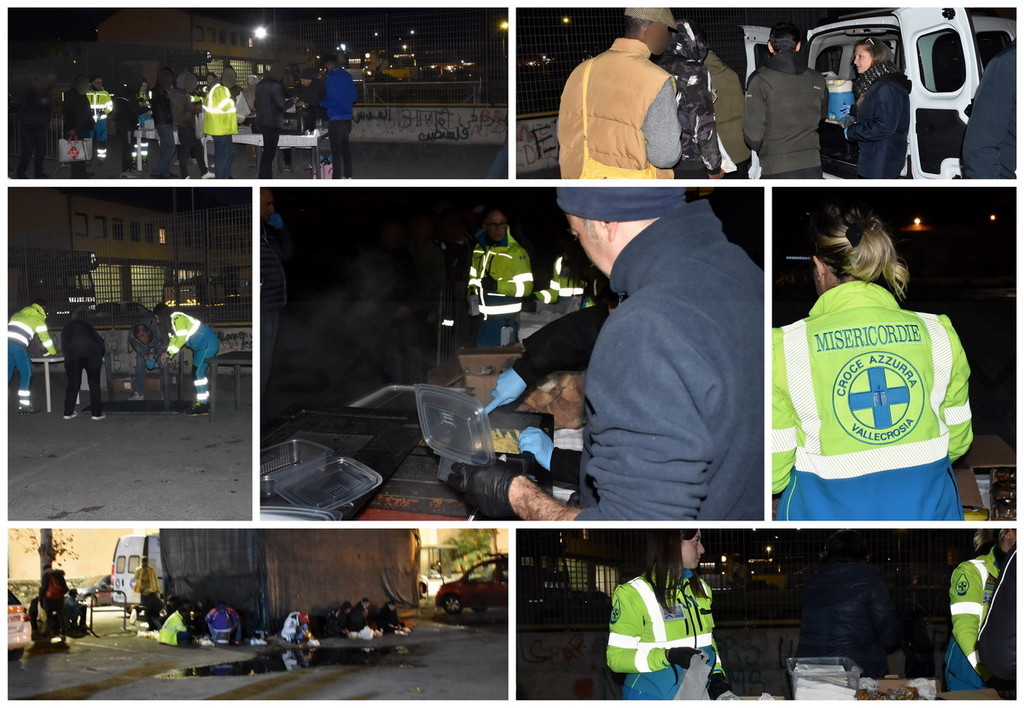 Con macchine e furgoncini ogni martedì sera i volontari italiani arrivano nel piazzale di fronte al cimitero della città di confine, allestiscono in poco tempo una tavolata su cui posizionano i contenitori al cui interno vi sono pasti caldi prepararti nel pomeriggio a Villa Gilardi, dai padri Somaschi o a casa dei volontari e, dopo essersi sistemati, iniziano la distribuzione del cibo alle persone che si mettono ordinatamente in fila e aspettano il loro turno per mangiare. Le persone in fila, principalmente migranti ma vi è anche qualche italiano in difficoltà, prima si igienizzano le mani, poi prendono un sacchetto di plastica in cui mettono le posate e i contenitori all'interno dei quali verrà servito il cibo e poi, dopo averlo preso, aspettano il proprio turno per prendere da bere, acqua o tè caldo. Infine si siedono in terra, al freddo e al buio, a consumare il pasto caldo tanto atteso.