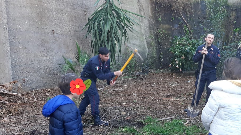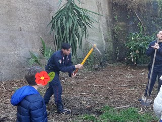 Terminata la lezione Massimiliano e Roberto, alla presenza dei bambini, hanno piantato nel giardino della scuola un piccolo abete bianco. I bambini e le insegnanti ringraziano il maresciallo Massimiliano Licitra e il carabiniere Roberto La Rosa per l'interessante lezione e per aver contribuito ad arricchire il nostro giardino di un nuovo 'abitante'".