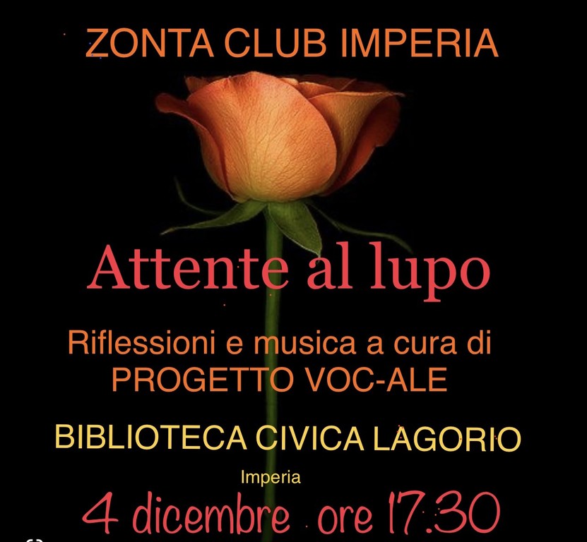 "Si parte il giorno 25 novembre - spiegano dallo Zonta - alle ore 18 con la celebrazione, presso la Chiesa di Cristo Re di Imperia, di una messa in suffragio di tutte le vittime di femminicidio. Dal 25 Novembre, inoltre, verranno apposti in vari spazi della città una serie di cartelloni che ribadiscono il dissenso e che rimarranno esposti fino alla data del 10 Dicembre. Si ringrazia, a tal proposito, la signora Roberta Gamberini per la sensibilità è la disponibilità dimostrata in questa iniziativa Domenica 4 Dicembre alle ore 17.30. Infine, presso la Biblioteca Civica L. Lagorio di Imperia, verrà messo in scena uno spettacolo con riflessioni e musica sul tema della violenza alle donne dal titolo: 'Attente al lupo'. Lo spettacolo è stato curato dal Progetto Voc-Ale di Imperia. Zonta Club Imperia ringrazia tutte le persone che hanno collaborato alla realizzazione del programma".