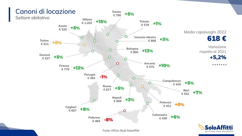 Quasi tutte le città mostrano il segno più davanti alla variazione dei canoni di affitto rispetto allo scorso anno, con pochissime eccezioni, come Perugia dove il calo è solo dell’1% o Palermo dove invece i prezzi sono in calo dell’8%.
