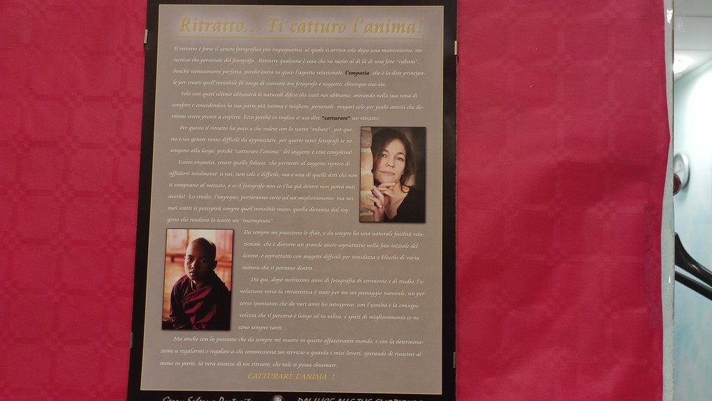 “E’ una mostra incentrata sulla ritrattistica” - spiega il fotografo Gerry Salerno - “Dopo molti anni dedicati alla fotografia di cerimonia e di eventi, sono passato a interessarmi e a praticare il genere del ritratto in ogni sua forma. Mi ha ispirato la mia predisposizione naturale al rapporto umano e all’empatia, che è la chiave di lettura per chi vuole cercare di entrare nella psicologia di un soggetto che si riprende ed è la condizione fondamentale affinché un ritratto si possa considerare tale. Vi sono foto che ritraggono anche persone di paesi molto lontani da noi. Ho idealmente diviso la mostra in alcune sezioni: family, che parla della famiglia; men e women, che sono ritratti realizzati in sala di posa o con un servizio commissionato; people, che sono stanzialmente fotografie di viaggi, ed emotional, che è la parte della mostra che cerca di tirare fuori la parte più intima delle persone ed è anche la più difficile da realizzare“.