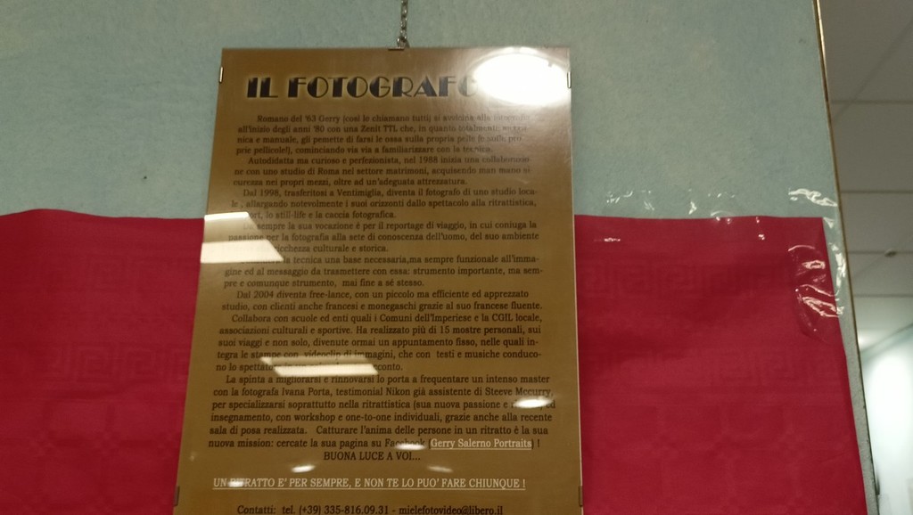 “Sono di Vallecrosia e abito in questa città e perciò con il comune, che mi sostiene sempre, ho un rapporto consolidato da anni. Da circa 30 anni mi occupo di fotografia" - racconta Gerardo Salerno - “Per circa 25 anni mi sono occupato di fotografia per cerimonie, come matrimoni, battesimi, comunioni e anniversari, eventi, sport, spettacolo e feste private mentre da circa quattro anni mi occupo maggiormente di ritrattistica. Sto cercando di approfondire sempre di più il ritratto. Ho conseguito recentemente un master con Nikon incentrato sulla ritrattistica e ho realizzato una mia sala di posa, uno spazio tutto mio in cui poter praticare e anche creare il giusto rapporto con i modelli e le persone che ritraggo. Ho scelto il ritratto perché dovrebbe esprimere, se ben gestito dal fotografo, la personalità del soggetto, attraverso gli occhi, la gestualità e la postura catturata nello scatto. Sono elementi che concorrono a descrivere, se ben interpretati, una persona e quindi a catturarne l’anima. In inglese realizzare un ritratto si dice ‘capture portraits’. Spesso le persone ritratte hanno delle barriere psicologiche che non è facile abbattere, qui entra perciò in gioco l’empatia, che è la capacità del fotografo di sintonizzarsi con il personaggio in modo tale che si possa fidare di lui e abbassare le difese naturali, che tutti noi abbiamo, in modo tale che il fotografo possa catturare la sua anima. E’ una cosa che può durare per un po’ di tempo oppure per pochi attimi e quindi la bravura e la capacità del fotografo sta nel riuscire a cogliere l’attimo catturandolo. Per riuscirci il fotografo deve avere delle doti naturali e avere una serie di capacità per riuscire a mettere a proprio agio la persona, ci vuole tanto tempo e a volte purtroppo capita che non ci si riesce. Ho realizzato anche altre mostre fotografiche, a Vallecrosia ma anche a Sanremo, e reportage, come quello che ho fatto qualche anno fa sul terremoto del centro Italia”.
