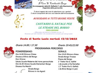 Don Massimo Crotta, l'organista Raffaella, alcuni membri della corale Santa Cecilia e altri del coro voci bianche dell'Annunciazione con alcuni bimbi del catechismo, porteranno canti, allegria e doni in tutto il rione del Borgo.