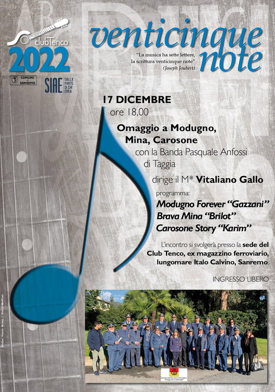 Sabato 17 dicembre, Venticinque note: 'Omaggio a Modugno, Mina, Carosone' con la Banda Pasquale Anfossi di Taggia, dirige il M° Vitaliano Gallo. Ore 18, sede del Club Tenco. Ingresso gratuito.