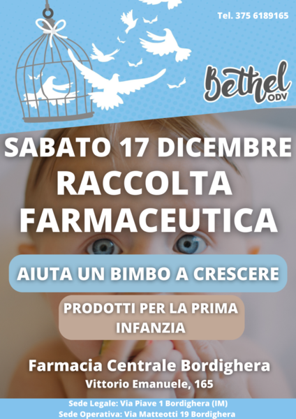 Annullata la raccolta farmaceutica e di prodotti per la prima infanzia prevista domani presso la Farmacia Centrale a Bordighera. Lo annuncia l'associazione Bethel organizzatrice dell’iniziativa.