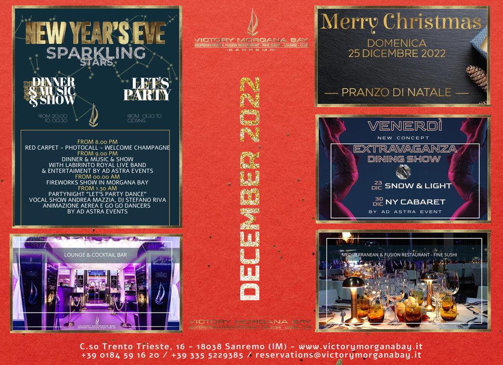 Festeggia il Capodanno 2023 al Victory Morgana Bay di Sanremo! Il famoso e rinomato locale tra i due porti della Città dei Fiori accompagnerà i suoi ospiti nella notte più magica e lunga dell’anno con un emozionante serata all'insegna del divertimento e del gusto.