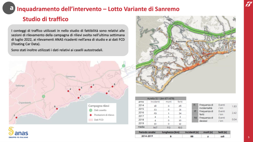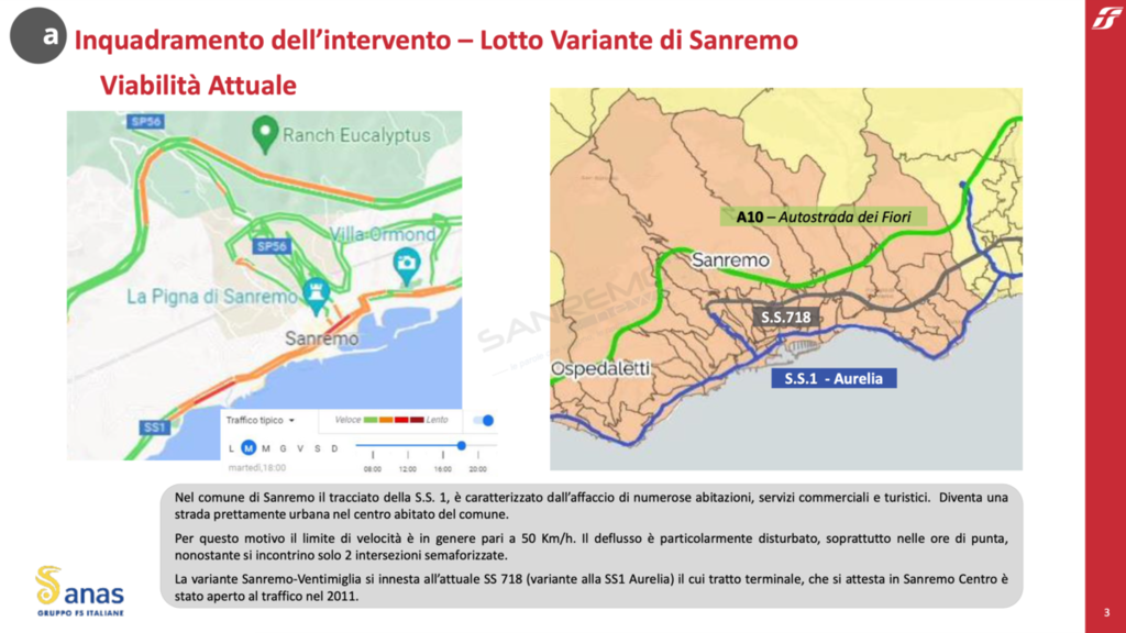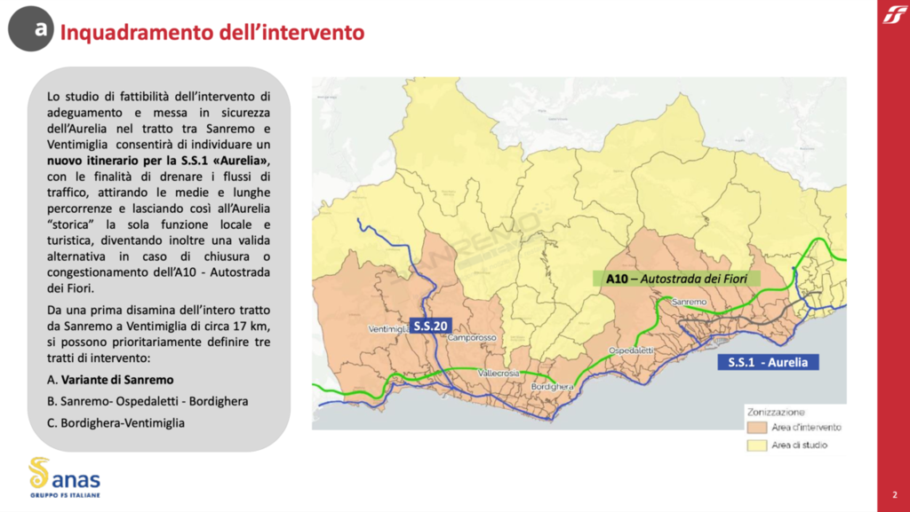 Sono state presentate oggi presso il Comune di Sanremo le 4 ipotesi di tracciato della Variante di Sanremo dell’Aurelia-Bis. L’opera, che sarà realizzata da Anas in sinergia con Governo, Regione Liguria, Provincia di Imperia e Comune di Sanremo, consiste nella realizzazione di un nuovo itinerario alternativo all’Aurelia con le finalità di drenare i flussi di traffico, attirando le medie e lunghe percorrenze. All’Aurelia storica sarà lasciata così la sola funzione locale e turistica, diventando inoltre una valida alternativa in caso di chiusura o decongestionamento della A10-Autostrada dei Fiori.