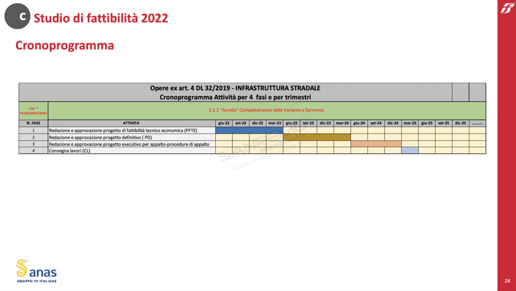 Riguardo alle tempistiche Anas, d’accordo con Governo ed Enti locali, conta di completare lo studio di fattibilità entro il mese di marzo. Una volta concluso l’iter burocratico-autorizzativo e reperiti i fondi necessari, si ipotizza la consegna dei lavori all’inizio del 2025.