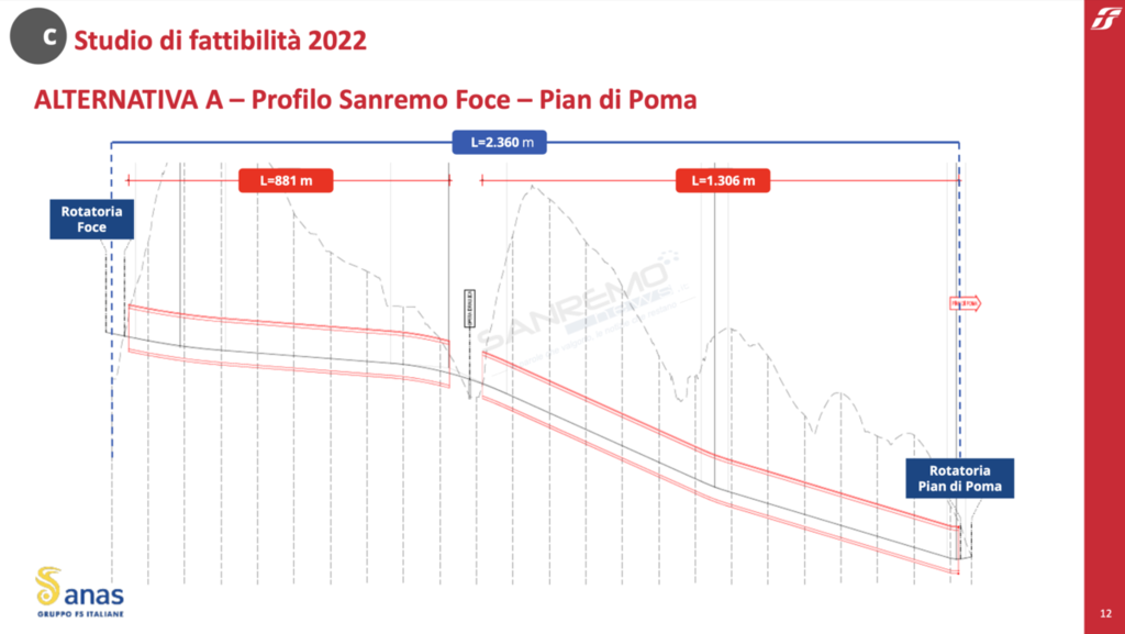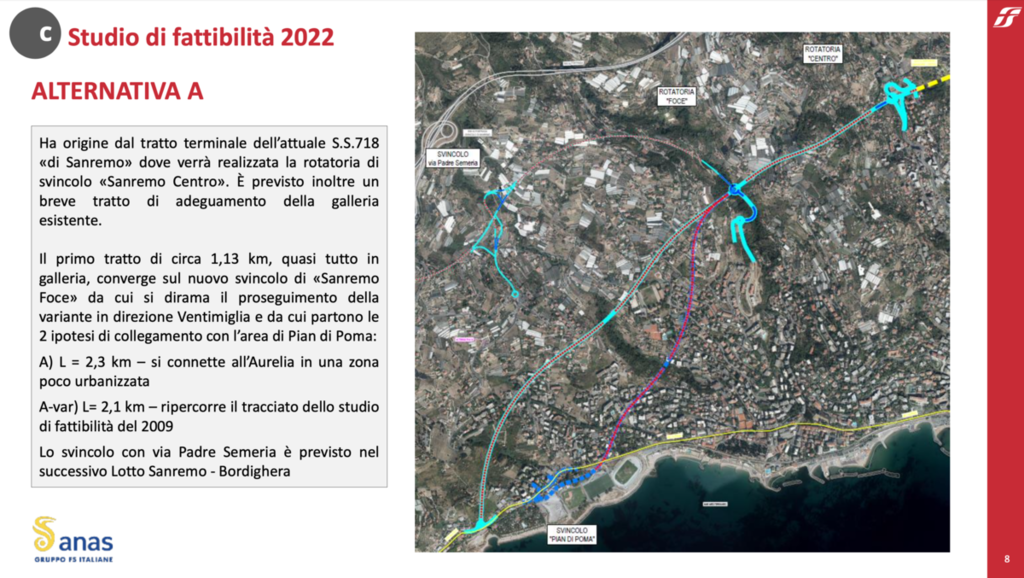 L’alternativa di tracciato A ha origine dal tratto terminale dell’attuale S.S. 718 di Sanremo, dove verrà realizzata la rotatoria di svincolo “Sanremo Centro”. È previsto inoltre un breve tratto di adeguamento della galleria esistente. Il primo tratto di circa 1,13 km, quasi tutto in galleria, converge sul nuovo svincolo di “Sanremo Foce” da cui si dirama il proseguimento della variante in direzione Ventimiglia e da cui partono le 2 ipotesi di collegamento con l’area di Pian di Poma: la prima, lunga 2,3 km, si connette all’Aurelia in una zona meno urbanizzata; la seconda, di 2,1 km, ripercorre il tracciato dello studio di fattibilità del 2009. Lo svincolo con via Padre Semeria è previsto nel successivo Lotto Sanremo-Bordighera.