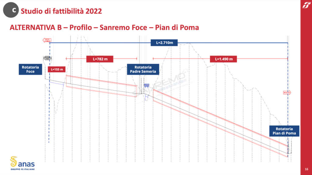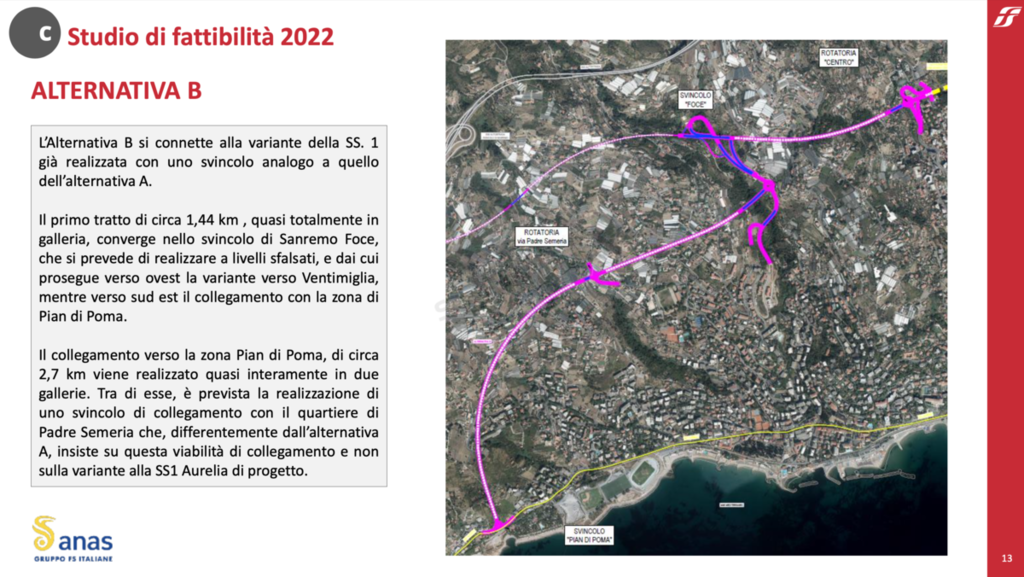 L’alternativa B si connette alla variante dell’Aurelia già realizzata con uno svincolo analogo a quello dell’alternativa A. Il primo tratto di circa 1,44 km, quasi totalmente in galleria, converge nello svincolo di “Sanremo Foce”, che si prevede di realizzare a livelli sfalsati, e da cui prosegue verso ovest la variante verso Ventimiglia e, verso sud-est, il collegamento con la zona di Pian di Poma. Quest’ultimo, di circa 2,7 km, verrebbe realizzato quasi interamente in due gallerie. Tra di esse è prevista la realizzazione di uno svincolo di collegamento con il quartiere di Padre Semeria che, a differenza dell’alternativa A, insiste su questa viabilità di collegamento e non sulla variante all’Aurelia di progetto.