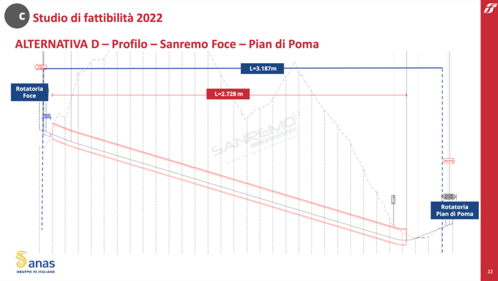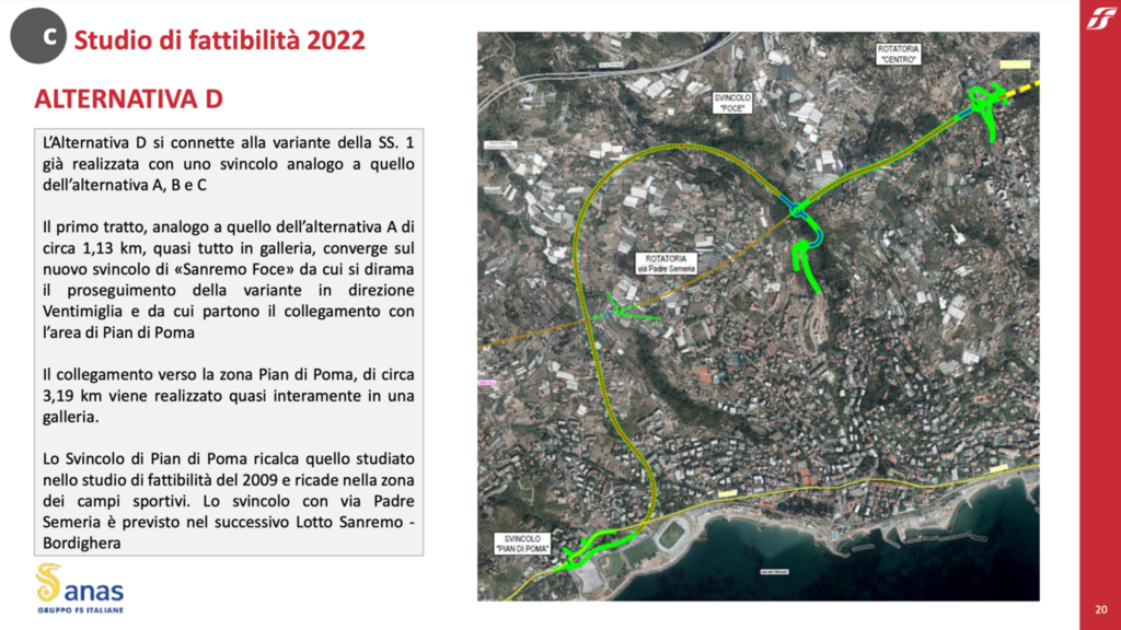 Infine, l’alternativa D si connette alla variante dell’Aurelia realizzata con uno svincolo analogo a quello delle alternative A, B e C. Il primo tratto, analogo a quello dell’alternativa A di circa 1,13 km, quasi tutto in galleria, converge sul nuovo svincolo di “Sanremo Foce” da cui si dirama il proseguimento della variante in direzione Ventimiglia e da cui parte il collegamento verso la zona Pian di Poma. Quest’ultimo, di circa 3,19 km, viene realizzato quasi interamente in una galleria. Lo svincolo “Pian di Poma” ricalca quello studiato nello studio di fattibilità del 2009 e ricade nella zona dei campi sportivi. Lo svincolo con via Padre Semeria è previsto nel successivo Lotto Sanremo-Bordighera.