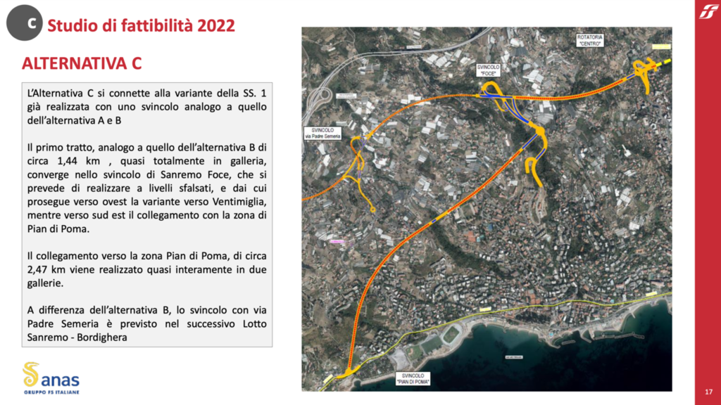 L’Alternativa C si connette alla variante dell’Aurelia già realizzata con uno svincolo analogo a quello delle alternative A e B. Il primo tratto, analogo a quello dell’alternativa B di circa 1,44 km, quasi totalmente in galleria, converge nello svincolo di “Sanremo Foce”, che si prevede di realizzare a livelli sfalsati, e da cui prosegue verso ovest la variante verso Ventimiglia. Mentre verso sud-est il collegamento verso la zona Pian di Poma, di circa 2,47 km, viene realizzato quasi interamente in due gallerie. A differenza dell’alternativa B, lo svincolo con via Padre Semeria è previsto nel successivo Lotto Sanremo-Bordighera.