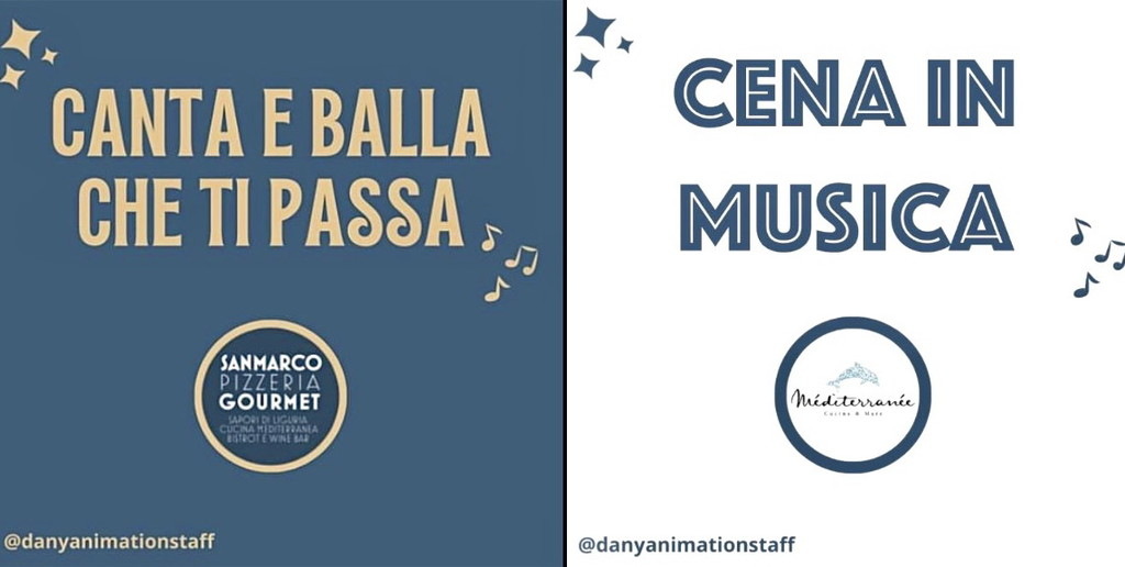 Sabato, dalle 20.30, serata animata al ristorante Mediterranèe di Sanremo, dove andrà in scena la ‘Cena in musica’ con le voci dal vivo di ‘Dany e Roby’, mentre nel dopocena si alzeranno i ritmi con Dj set.