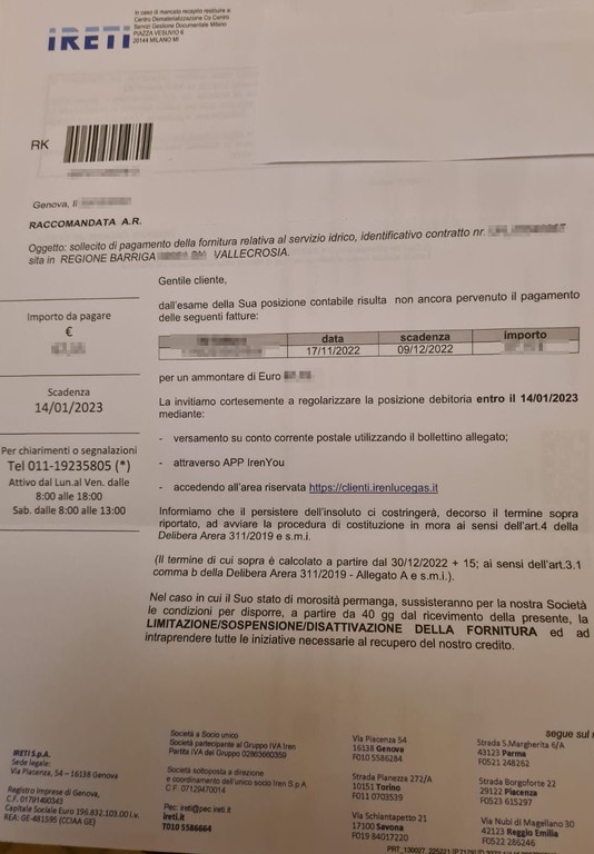 Solleciti di pagamento della fornitura relativa al servizio idrico Ireti, riguardante l’estremo Ponente ligure, sono giunti, lo scorso mese, a tante persone, anche se avevano già effettivamente pagato la bolletta. A diversi clienti è infatti arrivata una raccomandata nella quale si invitava a regolarizzare la posizione debitoria entro la data segnalata in caso contrario sarebbe stata avviata "la procedura di costituzione in mora. In caso lo stata di morosità permanga, inoltre, a partire da quaranta giorni dal ricevimento della raccomandata, la società può disporre la limitazione-sospensione-disattivazione della fornitura e intraprendere tutte le iniziative necessarie al recupero del credito”.