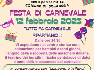 Organizzato Dal centro culturale “a Ciassa” con Il patrocinio del comune di Isolabona, “ dopo 2 anni di stop dovuti alla pandemia, ritorna una bella manifestazione, che vuole riportare in piazza il buon umore e l'allegria. Tanti i giochi dedicati ai bambini: il trenino , le marionette ed anche uno spazio dedicato alla storia delle maschere Italiane. Con grande piacere come sempre saranno ospiti d’onore i ragazzi della Spes.