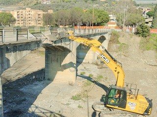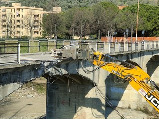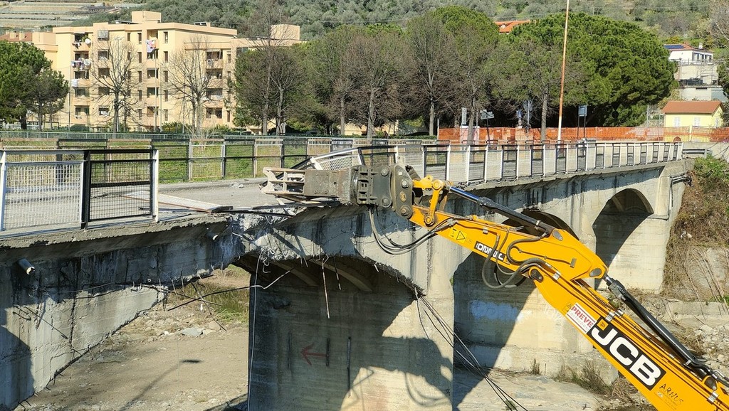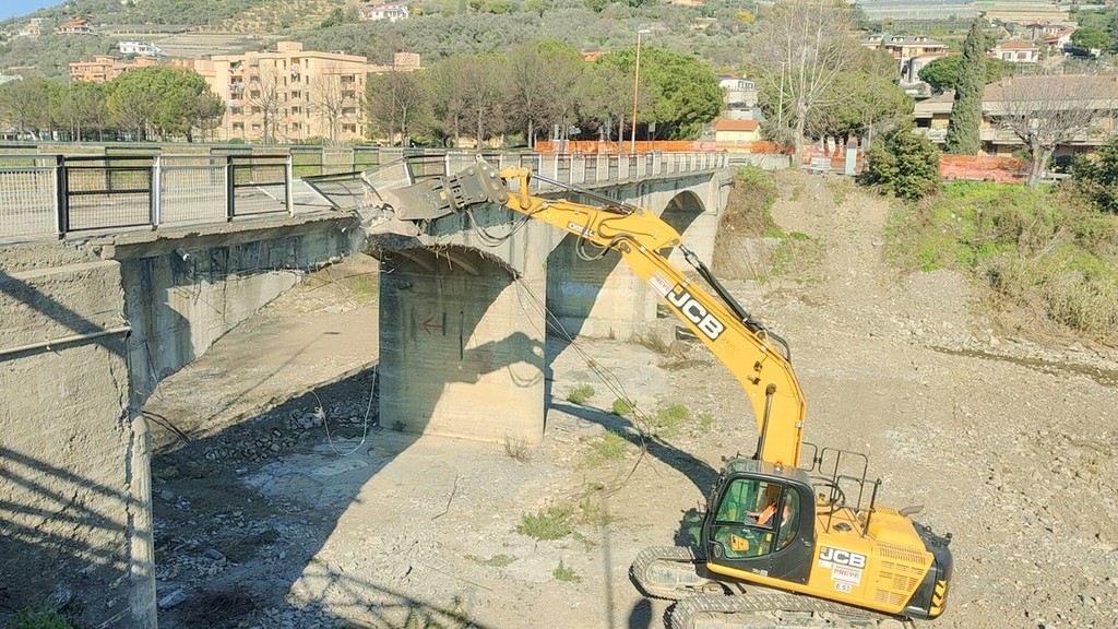 Ha preso il via nel primo pomeriggio di oggi l’abbattimento del ponte sul Prino ai Piani di Imperia ad opera dell’impresa Preve di Roccavione in provincia di Cuneo.