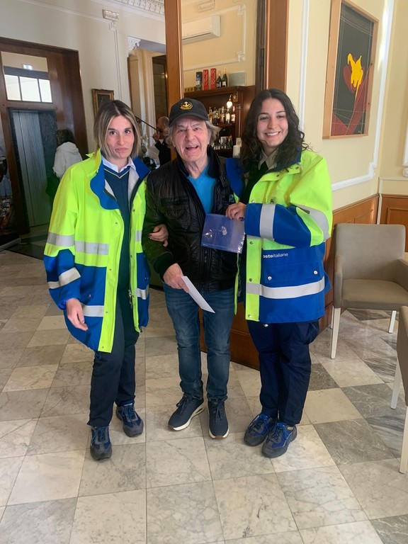 Le due Portalettere, Lucia Garibaldi e Mary Risso, facenti parte della squadra del Recapito Area Manager di Imperia, Savona e Alessandria, Pasquale Vitiello e accompagnate dalla Direttrice di Filiale di Imperia, Nadia Paternostro, hanno omaggiato il famoso cantante, che è rimasto stupito e contento per il dono inaspettato.