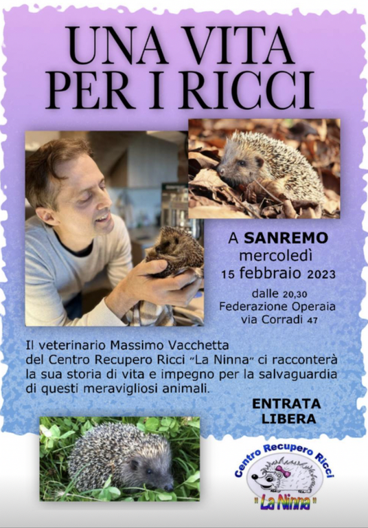 Mercoledì 15 febbraio, alle ore 20.30, la Federazione Operaia di Sanremo (via Corradi, 47) ospiterà il veterinario Massimo Vacchetta, Presidente del Centro di Recupero Ricci “La Ninna” per l’incontro “Una Vita per i Ricci”, dedicato alla cittadinanza sanremese. L’ingresso è libero.