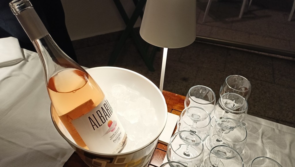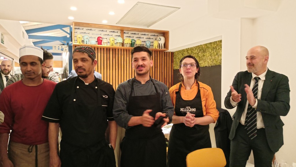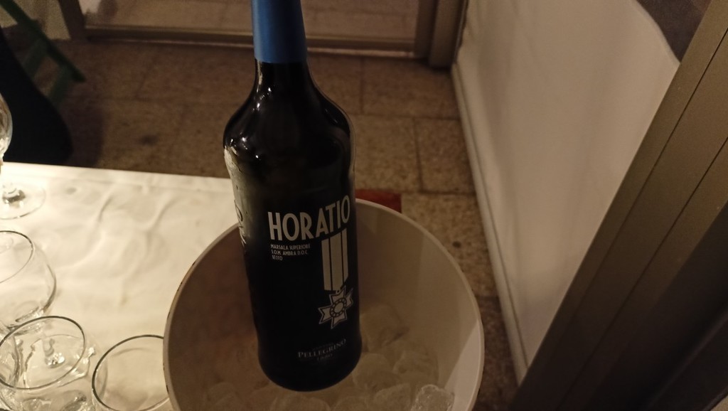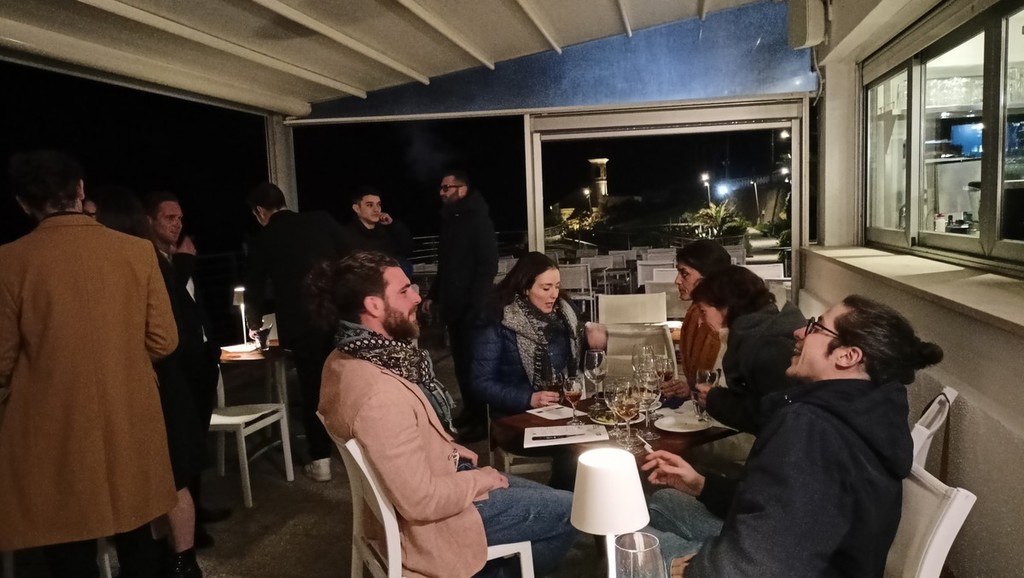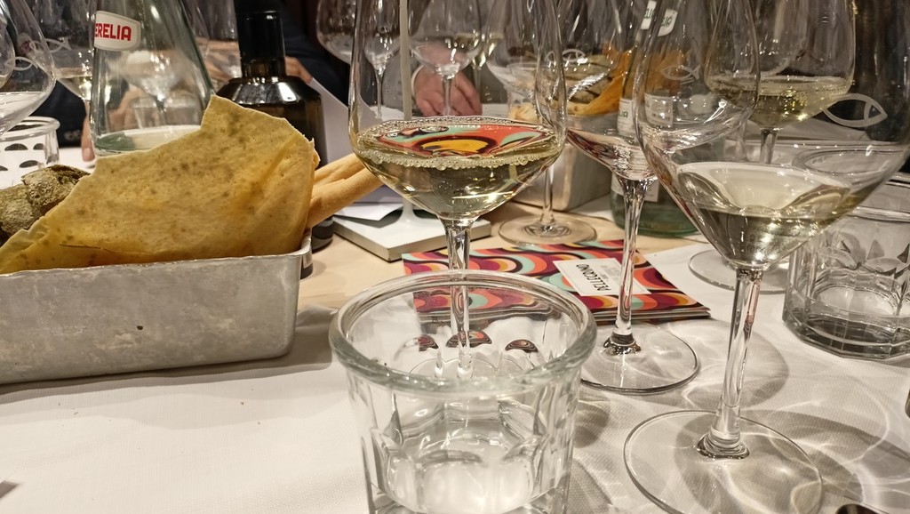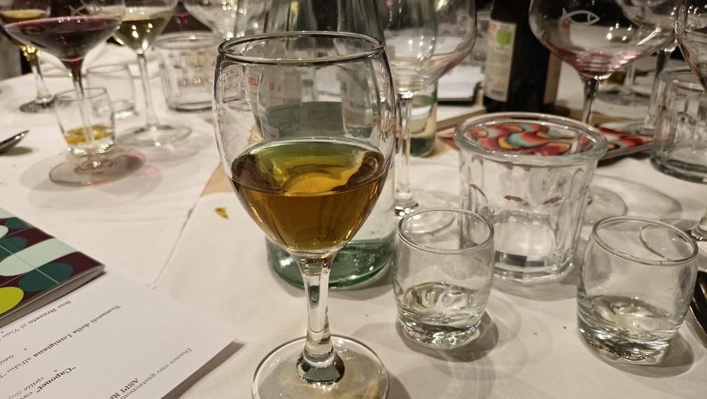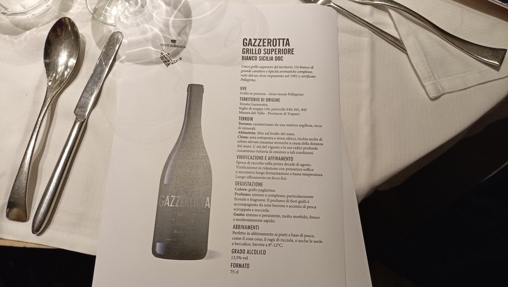 Per l’aperitivo sono stati proposti acciughe imbottite ‘pane pesto, uova, erbette, aromi officinali’; frittelle di baccalà e pinoli; cozze alla Parmesana con cilanto e reggiano 30 mesi; tapinambur alla Bagna Caoda Monferrina e focaccia di Cristoforo Colombo con bietoline e zafferano accompagnati da uno Gibilé Zibibbo secco del 2021, da un’Albaria Frappato rosé del 2021 e da Horatio Marsala superiore Som del 2011 Ambra secco Doc.