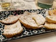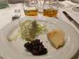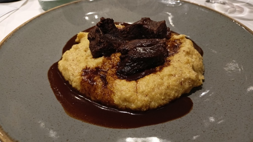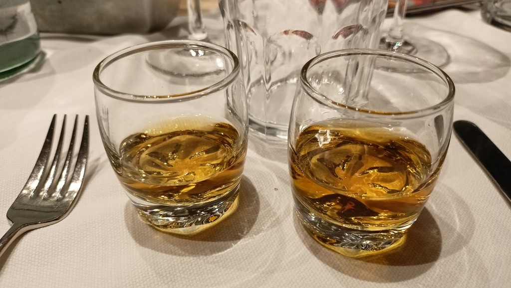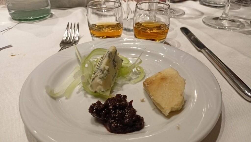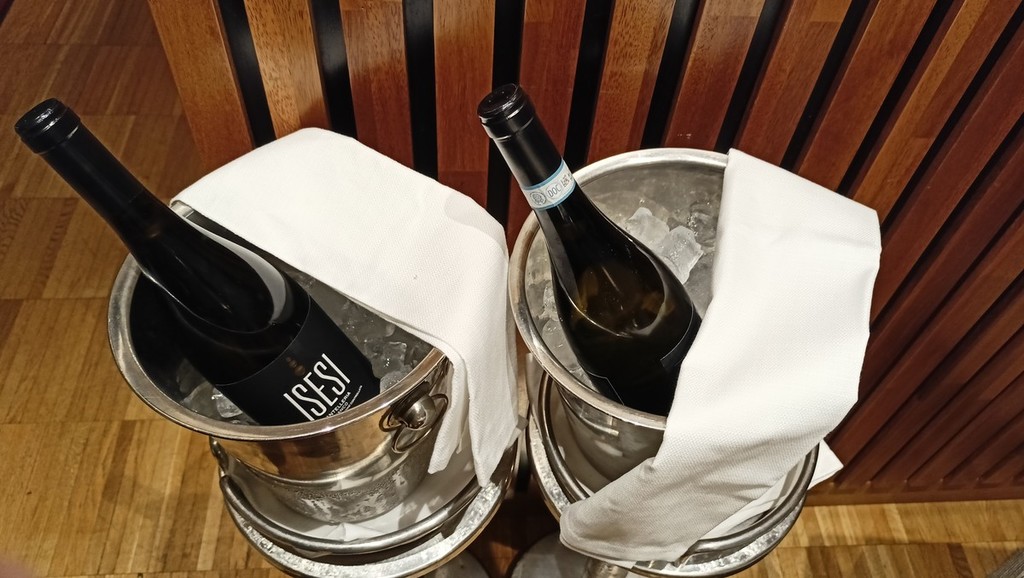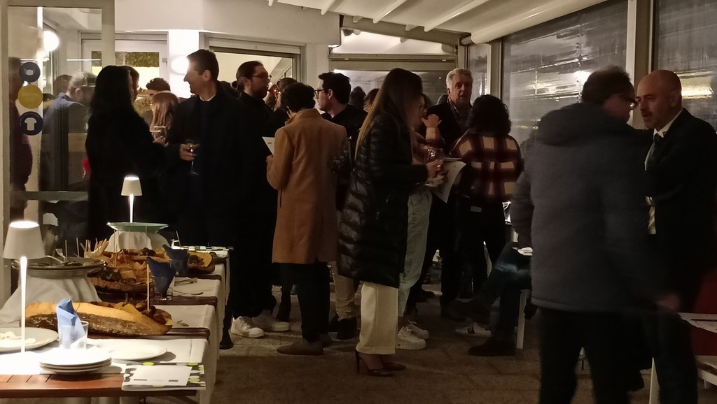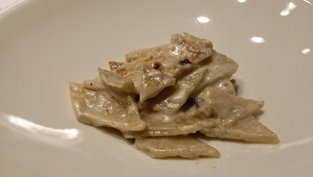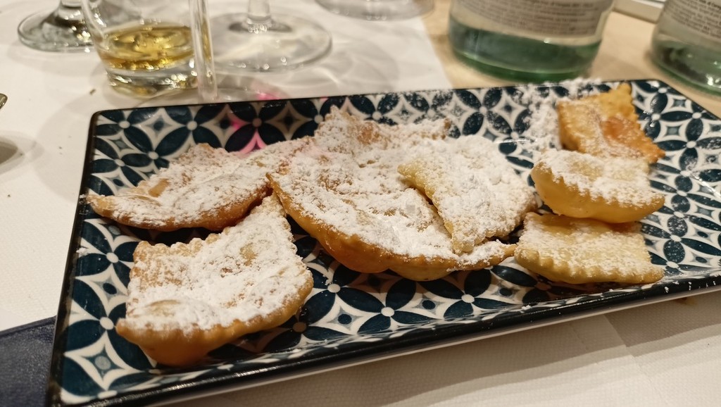 Per l’aperitivo sono stati proposti acciughe imbottite ‘pane pesto, uova, erbette, aromi officinali’; frittelle di baccalà e pinoli; cozze alla Parmesana con cilanto e reggiano 30 mesi; tapinambur alla Bagna Caoda Monferrina e focaccia di Cristoforo Colombo con bietoline e zafferano accompagnati da uno Gibilé Zibibbo secco del 2021, da un’Albaria Frappato rosé del 2021 e da Horatio Marsala superiore Som del 2011 Ambra secco Doc.