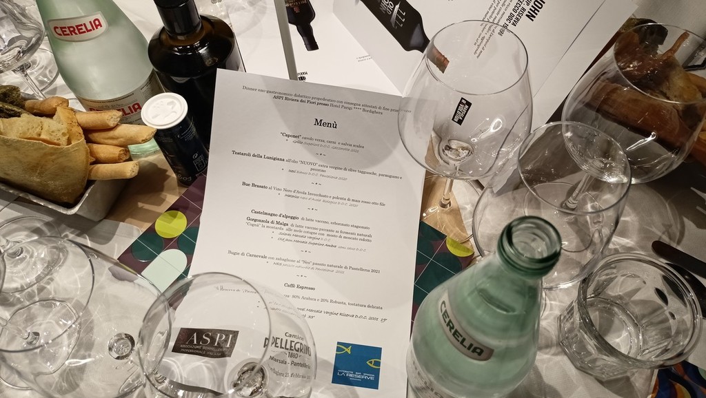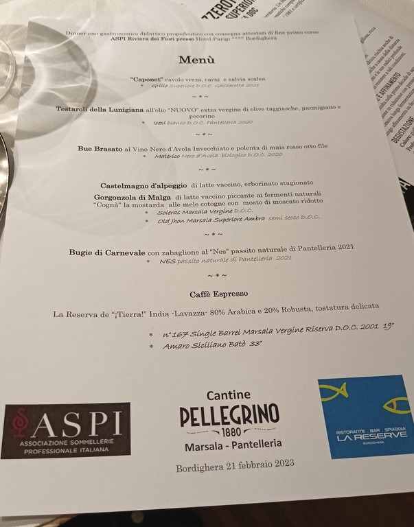 Il menù della cena prevedeva diverse portate. E’ iniziato con Caponet di cavolo verza, carni e salvia scalea accompagnato da un Grillo superiore Doc Gazzerotta del 2021. In seguito sono stati serviti Testaroli della Lunigiana all’olio nuovo extra vergine di olive taggiasche, parmigiano e pecorino accompagnato da un Isesi bianco Doc Pantelleria del 2020. Successivamente il Materico nero d’Avola biologico Doc 2020 ha accompagnato il bue brasato al vino nero d’Avola invecchiato e polenta di mais rosso otto file. Il Castelmagno d’alpeggio di latte vaccino, erborinato stagionato e il Gorgonzola di Malga di latte vaccino piccante ai fermenti naturali con Cognà, la mostarda alle mele cotogne con mostro di Moscato ridotto, si sono potuti degustare con un Soleras Marsala Vergine Do e un Old Jhon Marsala Superiore Ambra semi secco Doc. La cena si è conclusa le bugie di Carnevale con zabaglione al Nes passito naturale di Pantelleria del 2021 accompagnato dal Nes passito naturale di Panteleria del 2021, un caffè espresso della Reserva de Tierra India-Lavazza-80 per cento arabica e 20 per cento robusta, tostatura delicata. Infine sono stati serviti il n° 167 Single Barrel Marsala Vergine Riserva Doc del 2001 19° e un amaro siciliano Batò 33°. Ogni prodotto delle cantine Pellegrino, durante la cena, è stato spiegato, a turno, dai corsisti che hanno dimostrato così di aver appreso appieno le nozioni base tecnico-culturali necessarie per passare al secondo livello. Il corso si articola infatti su tre livelli, dove al termine dei primi due si ottiene la qualifica di Mastro Coppiere.