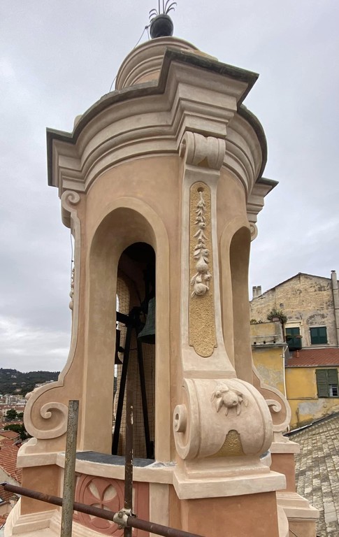 “L’aspetto che tutti ricordiamo è quello di un tono giallino dilavato dalle intemperie che non faceva presagire la ricchezza e la vivacità dei colori originari, sia del campanile che della parte alta della facciata con lo splendido stucco di Luigi Varese rappresentante i simboli papali petrini racchiuso tra esili lesene decorate a finto marmo. Il campanile – precisa la professionista - ha rivelato minute decorazioni a stucco dello stesso Varese con prodotti della terra di Liguria, frutti, agrumi e fiori. Una sorpresa per tutti noi”.