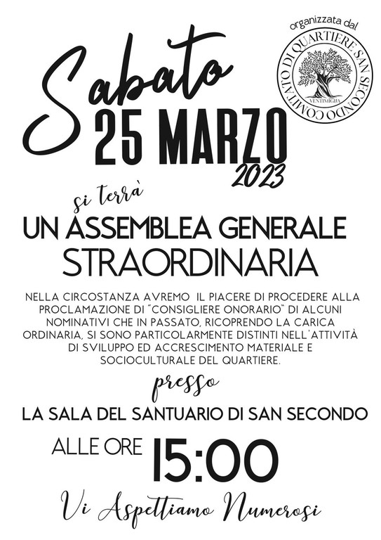 Il comitato di quartiere di San Secondo a Ventimiglia organizzerà un’assemblea generale straordinaria incentrata sulla destinazione della via San Secondo a 'strada di scorrimento'. L’appuntamento è previsto sabato 25 marzo alle 15 presso la sala del santuario di San Secondo.