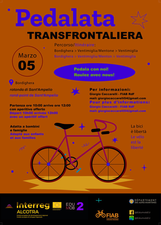 Promossa da Regione Liguria, Dipartimento francese delle Alpi Marittime e le amministrazioni dei comuni coinvolti, la tre giorni si apre venerdì 3 marzo con il Seminario “EDUMOB2 e le ciclovie EuroVelo 8 e Tirrenica”, organizzato da FIAB Federazione Italiana Ambiente e Bicicletta Riviera dei Fiori, in programma al Forte dell’Annunziata di Ventimiglia a partire dalle ore 9,30. Un autorevole ventaglio di relatori farà il punto sugli esiti del progetto EDUMOB2. Interventi specifici sono dedicati, poi, alla presentazione di EuroVelo (la rete ciclabile europea con 56mila km già pedalabili dei 93mila previsti, che compie quest’anno 25 anni di cui FIAB-Federazione Italiana Ambiente e Bicicletta è coordinatore nazionale), della Ciclovia del Mediterraneo EV8 in Francia e Italia e della Ciclovia Tirrenica. Si parlerà, inoltre, dell’intermodalità bici+treno.