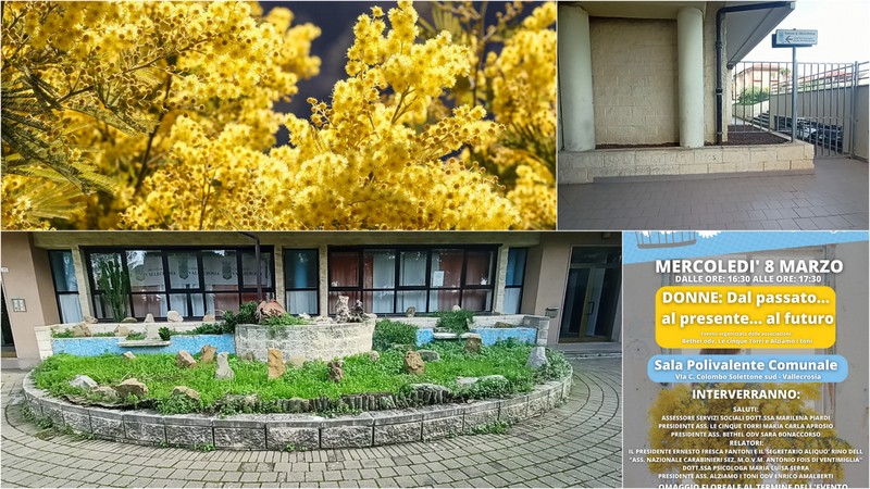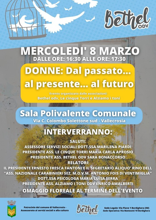L'associazione Bethel Odv, in collaborazione con Le cinque torri e Alziamo i toni, mercoledì prossimo organizzerà un incontro su “Donne: Dal passato...al presente...al futuro” in occasione della Giornata internazionale della donna. L’appuntamento sarà dalle 16.30 alle 17.30 presso la sala polivalente, sul solettone sud, in via Cristoforo Colombo a Vallecrosia.