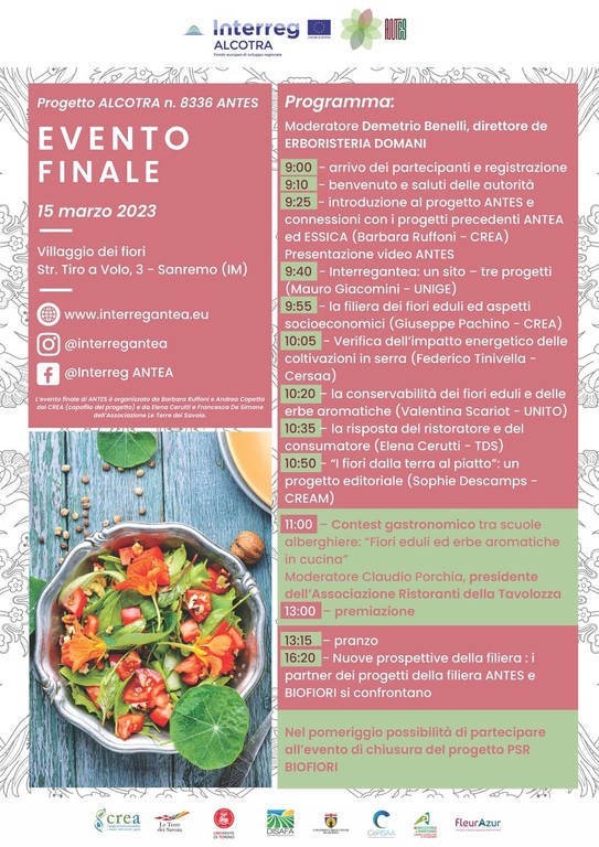Questo progetto, candidato con successo sul programma Interreg-Alcotra 2014-2020 ha operato in un contesto di cooperazione transfrontaliera con l’obiettivo di capitalizzare i risultati e le attività prodotte in due progetti predecessori: ANTEA ed ESSICA. Il nuovo progetto ha riunito alcuni dei partner precedenti ponendo attenzione al confezionamento, alle caratteristiche nutrizionali e metaboliche legate alla salute umana. Il progetto aveva infatti tra gli obiettivi quello di divulgare la cultura dell’utilizzo dei fiori eduli accompagnati da erbe aromatiche per impiego come ingrediente di preparazioni originali e di qualità. Nello specifico Antes ha perseguito l’obiettivo di creare un modello utile ad altre filiere agro-alimentari emergenti con un ampliamento dell’offerta produttiva per i fiori commestibili.