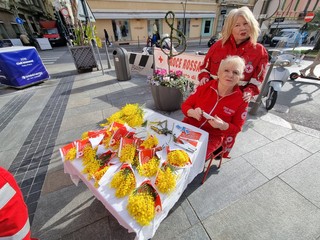Lo spunto è stata sicuramente la ‘Giornata Internazionale della Donna’ e, grazie alla generosa donazione del fiore simbolo da parte di un imprenditore del settore, la Croce Rossa ha confezionato sul posto centinaia di piccoli mazzi accompagnati da biglietti dove venivano indicate sia le coordinate bancarie per il 5 per mille sia il numero di cellulare dello Sportello della Gentilezza che fa fronte alle esigenze sociali delle persone che necessitano sia aiuti alimentari che di ascolto.