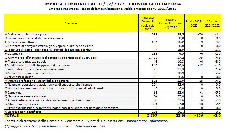 Secondo i dati dell’Osservatorio per l’Imprenditorialità femminile - Unioncamere ed InfoCamere, elaborati dall’Ufficio Studi e Orientamento al lavoro della Camera di Commercio Riviere di Liguria, al 31 dicembre 2022 in provincia di Imperia si contano complessivamente 5797 imprese femminili.